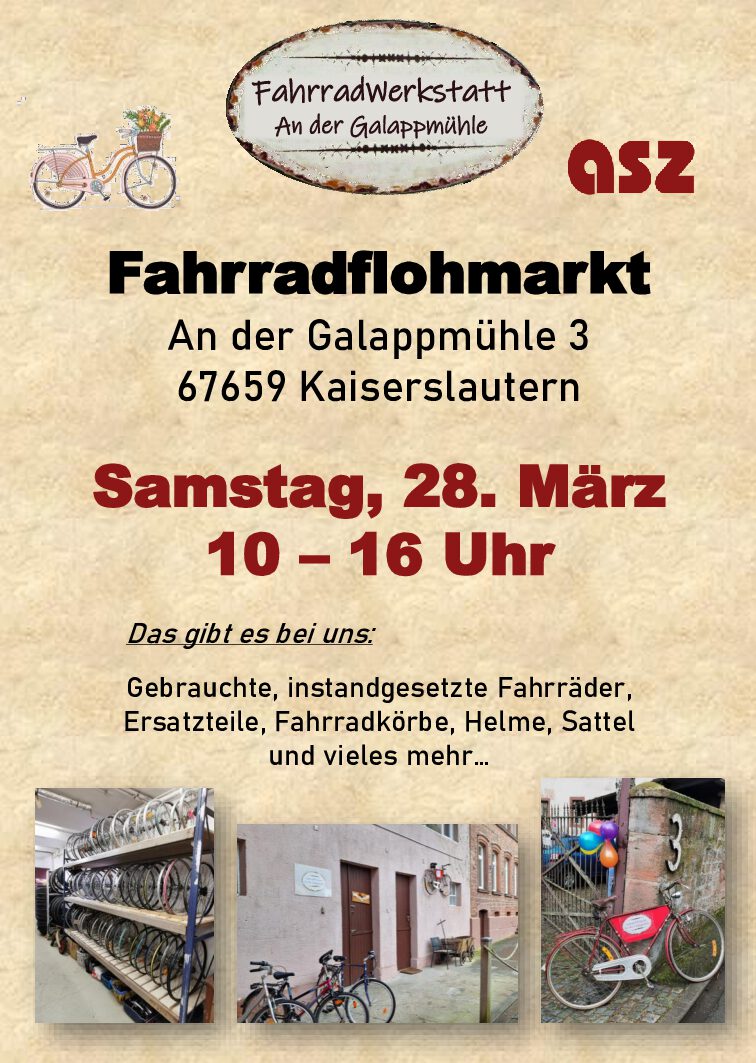 Am Samstag, den 23. März 2024, veranstaltet das ASZ den ersten Fahrradflohmarkt des Jahres an der Galappmühle. Von 10 – 16 Uhr kann man bei Kaffee und Kuchen Fahrräder und... weiterlesen →